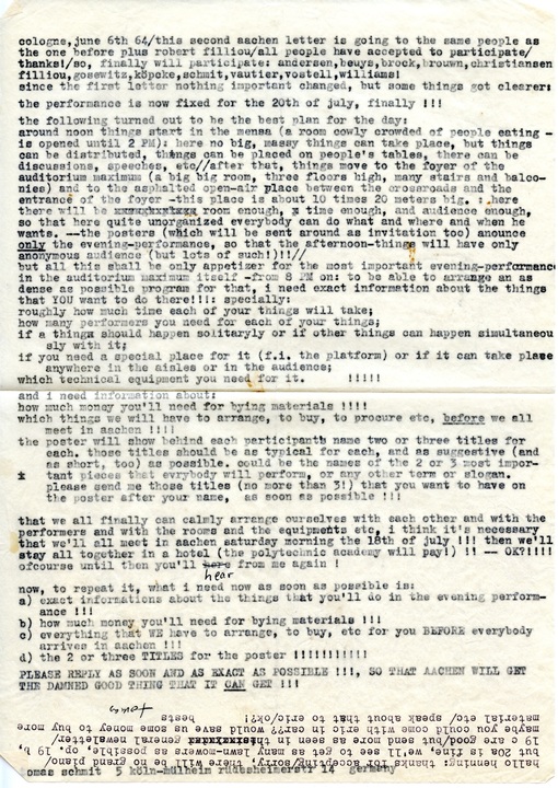 cologne, june 6th 64/this second aachen letter is going to the same people as the one before plus robert filliou/all people have accepted to participate/thanks!/so, finally will participate: andersen, beuys, brock, brouwn, christiansen, filliou, gosewitz, köpcke, schmit, vautier, vostell, williams!