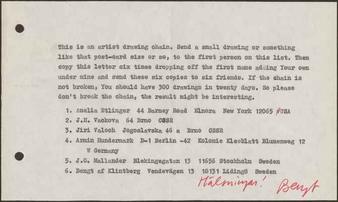 This is an artist drawing chain. Send a small drawing or something like that post-card size or so, to the first person on this list. Then copy this letter six times dropping off the first name adding Your own under mine and send these six copies to six friends. If the chain is not broken, You should have 300 drawings in twenty days. So please don’t break the chain, the result might be interesting.