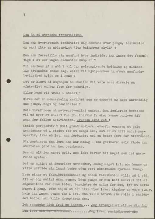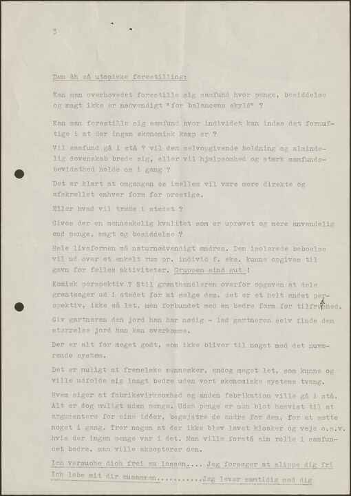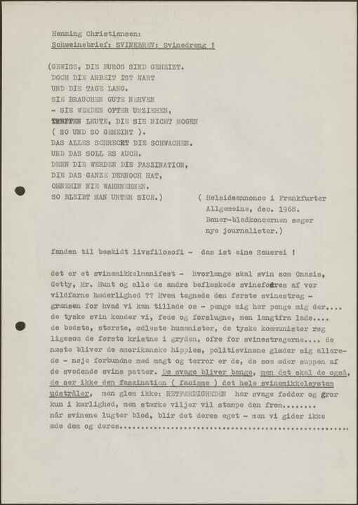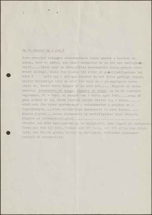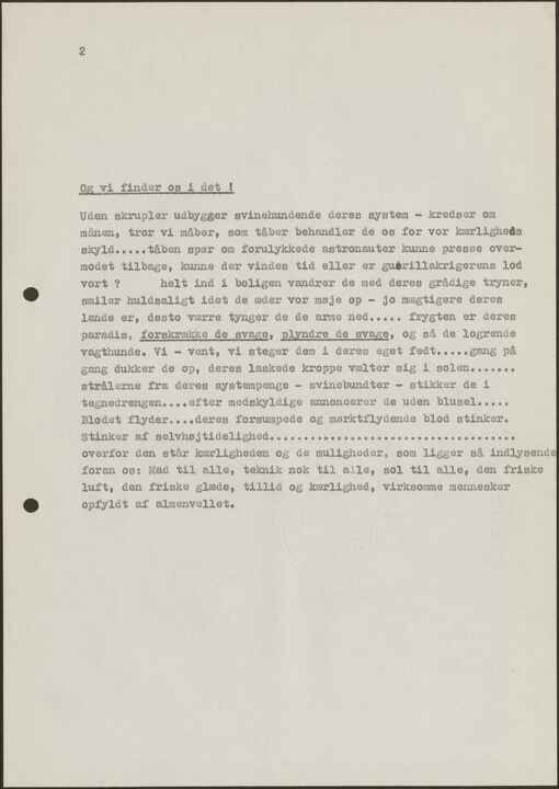 Uden skrupler udbygger svinehundene deres system - kredser om månen, tror vi måber, som tåber behandler de os for vor kærligheds skyld..... tåben spør om forulykkede astronauter kunne presse overmodet tilbage, kunne der vindes tid eller er guerillakrigerens lod vort? helt ind i boligen vandrer de med deres grådige tryner, smiler huldsaligt idet de æder vor møje op - jo mægtigere deres lande er, desto værre tynger de de arme ned..... frygten er deres paradis, forskrække de svage, plyndre de svage, og så de logrende vagthunde. Vi - vent, vi steger dem i deres eget fedt...... gang på gang dukker de op, deres laskede kroppe vælter sig i solen........ strålerne fra deres systempenge - svinebundter - stikker de i tegnedrengen.... efter medskyldige annoncerer de uden blusel...... Blodet flyder.... deres forsumpede og mørktflydende blod stinker. Stinker af selvhøjtidelighed...................................... overfor den står kærligheden og de muligheder, som ligger så indlysende foran os: Mad til alle, teknik nok til alle, sol til alle, den friske luft, den friske glæde, tillid og kærlighed, virksomme mennesker opfyldt af almenvellet.