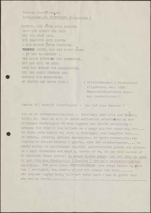 det er et svinemikkelmanifest - hvorlænge skal svin som Onassis, Getty, Mr. Hunt og alle de andre beflæskede svinefodres af vor vildfarne hæderlighed?? Hvem tegnede den første svinestreg - grænsen for hvad vi kan tillade os - penge mig her penge mig der.... de tyske svin kender vi, fede og forslugne, men langtfra lade.... de bedste, største, ædleste humanister, de tyske kommunister, røg ligesom de første kristne i gryden, ofre for svinestregerne.... de næste bliver de amerikanske hippies, politisvinene glæder sig allerede - nøje forbundne med magt og terror er de, de som æder suppen af de svedende svins patter. De svage bliver bange, men det skal de også de ser ikke den faszination ( facisme ) det hele svinemikkelsystem udstråler, men glem ikke: RETFERDIGHEDEN bar svage fødder og gror kun i kærlighed, men stærke viljer vil stampe den frem......... når svinene lugter blod, biir det deres eget - men vi gider ikke æde dem og deres......................................