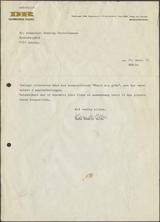 Vedlagt returneres bånd med kompositionen ”Musik als grün”, som har været bedømt i musikafdelingen.