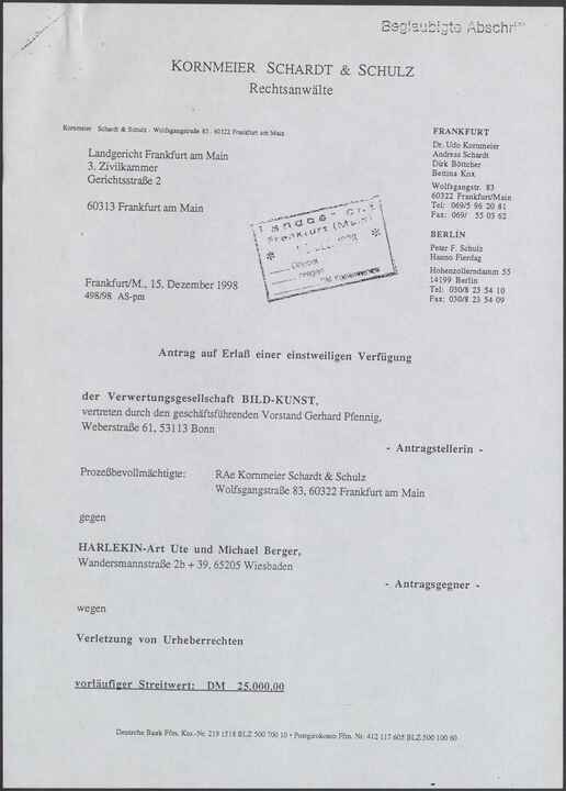 Prozeßbevollmächtigte: RAe Kornmeier Schardt & Schulz