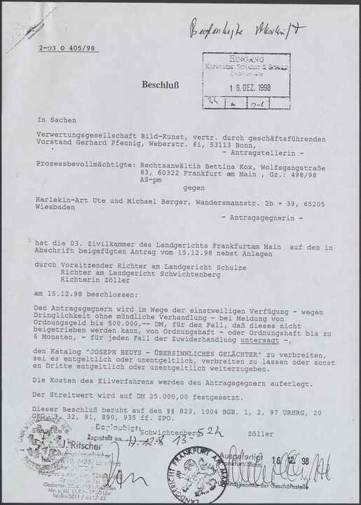 Ansøgning om påbud i forbindelse med Harlekin Arts publikation "Joseph Beuys-Übersinnliches Gelächter"