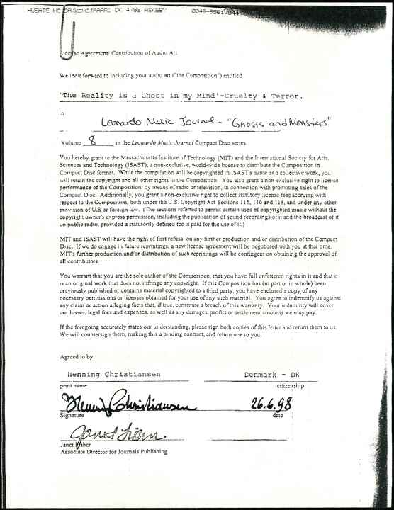 Publikationsaftalen for artiklen "The Reality is a Ghost in my Mind", Leonardo Music Journal, no. 8, 1998.