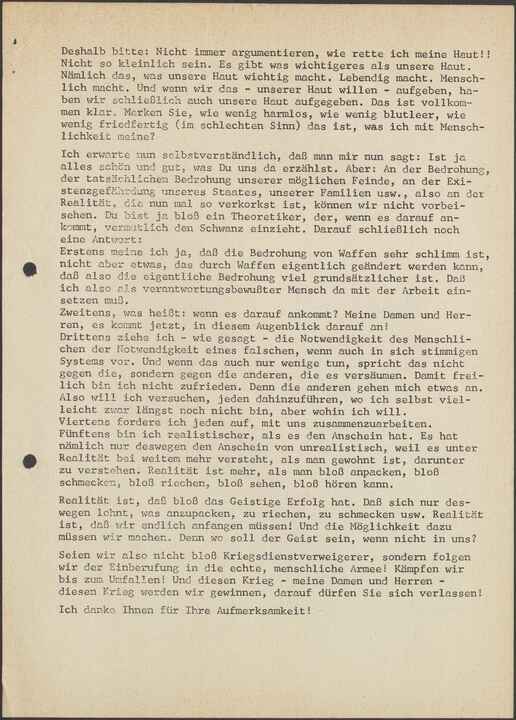 Ich komme nun zum Schluß. Selbstverständlich habe ich ununterbrochen von den Kriegsdienstverweigerern gesprochen. Denn wir kann ich angesichts dieser Tatsachen noch Kriegsdienst leisten? Wie kann ich denn wagen, dadurch, daß ich die Früchte eines von mir verabscheuten Denkens esse, dieses Denken auch noch unterstützen? Das ist doch absurd - oder nicht? Aber, wie gesagt: Bloß den Kriegsdienst zu verweigern, das hieße: den Teufel mit Beelzebub austreiben wollen, Ich tue natürlich sehr viel mehr als den Kriegsdienst verweigern. Und das ist wichtig. Die Kriegsdienstverweigerung ist ja lediglich eine Konsequenz. Ich tue sehr viel mehr. Das hat mit Eitelkeit nichts zu tun, meine Damen und Herren! Aber meine Bescheidenheit reicht nun einmal nur soweit, als sie nicht unter mein Niveau sinkt. Ich tue sehr viel mehr als bloß den Kriegsdienst verweigern. Mein Ziel ist nämlich - und das ist wichtig - nicht die Bequemlichkeit. Daß ich selbstverständlich dauernd scheitere, besagt nichts gegen das von mir erstrebte Ziel, sondern besagt bloß was in Bezug auf meine Schwächlichkeit. Aber mit der finde ich mich nicht ab! Gerade die will ich ja bekämpfen. Aber nicht nur bei mir. Wir alle müssen uns zusammentun, damit es besser geht. Mit jedem von uns. Denn es kommt nur deshalb auf den einzelnen an, insofern es auf alle ankommt. Deswegen ist es auch relativ bedeutungslos, ob ich meinen Erfolg mit diesen Bemühungen noch massiv miterlebe. Es spielt keine Rolle. Eins steht fest: Der Tod kann nur das beenden, was sterben kann. Aber es gibt etwas, das nicht sterben kann. Der Geist. Denn er ist ja das Gegenteil von Tod. Das hat nichts mit naiver Gläubigkeit zu tun: es ist eine Selbstverständlichkeit. Menschen, die sich nicht am Geist orientieren, sind längst schon tot. Deswegen ist es ein Hirngespinst zu glauben, man könne sich auf das verlassen, was irgendwo irgendwann einmal in irgendeinem komischen Himmel oben über den Wolken geschieht. Aber eins ist genau so ein Hirngespinst: Nämlich zu glauben, daß das Leben ohne die Orientierung an dem, was unsterblich ist, Leben sei. Zu glauben, der Tod könne etwas beenden, was wichtiger ist als er.