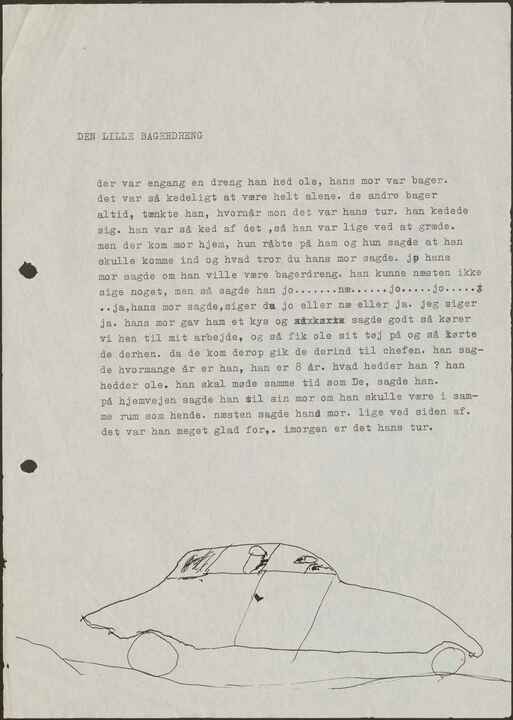 der var engang en dreng han hed ole, hans mor var bager. det var så kedeligt at være helt alene, de andre bager altid, tænkte han, hvornår mon det var hans tur. han kedede sig. han var så ked af det,så han var lige ved at græde. men der kom mor hjem, hun råbte på ham og hun sagde at han skulle komme ind og hvad tror du hans mor sagde. jo hans mor sagde om han ville være bagerdreng, han kunne næsten ikke sige noget, men så sagde han jo........næ......jo.....jo...... ..ja, hans mor sagde, siger du jo eller næ eller ja. jeg siger ja. hans mor gav ham et kys og sagde godt så kører vi hen til mit arbejde, og så fik ole sit tøj på og så kørte de derhen. da de kom derop gik de derind til chefen, han sagde hvormange år er han, han er 8 år. hvad hedder han? Han hedder ole. han skal møde samme tid som De, sagde han.