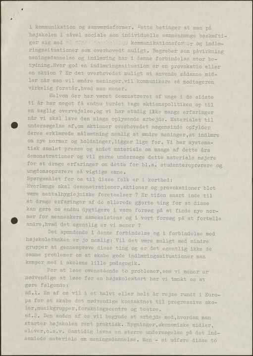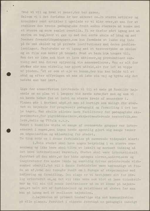 Planen går i korthed ud på, at man så hurtigt som muligt får startet en højskole for progressiv pædagogik og formidling i det hele taget. Man skulle således have faciliteter for pædagogiske eksperimenter, for pigtrådsmusikere, eksperimenterende teaterfolk, malere, radio og TVfolk o.s.v.