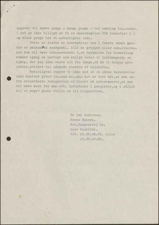 Dette er derfor en henvendelse som i første række fælder et økonomisk spørgsmål. Alle de grupper eller enkeltpersoner som vil være interesserede i, at højskolen for formidling kommer igang så hurtigt som muligt beder vi indtrængende om hjælp. Det kan ikke vente alt for længe, så må vi droppe projektet, hvilket vil udskyde starten af højskolen.