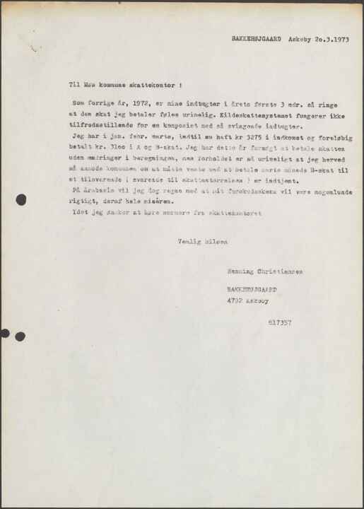 Som forrige år, 1972, er mine indtægter i årets første 3 mdr. så ringe at den skat jeg betaler føles urimelig. Kildeskattesystemet fungerer ikke tilfredsstillende for en komponist med så svingende indtægter.