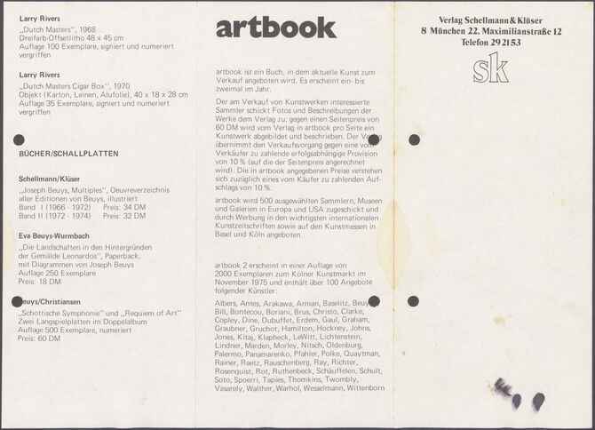 artbook 2 erscheint in einer Auflage von 2000 Exemplaren zum Kölner Kunstmarkt im November 1975 und enthält über 100 Angebote folgender Künstler: