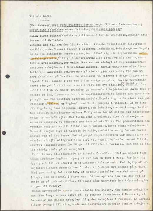 Vitrohm kom til Møn for 15 år siden. Vitrohm fremstiller elektronske artikler, moderfirmaet ligger i Glostrup, København. Fabriksejeren Engel så de nye spændende Perspektiver, der tilbød sig ude i provinsen. Egnsudviklingsstøtte, billige industriegrunde, og frem for alt den nøjsomme lokale arbejdskraft, der endnu ikke var så ødelagt af fagforeningernes krav, som arbejderne i Hovedstadsområdet. Engel udnyttede alle disse faktorer. Manglende konkurrence på stedet gjor det mulig for ham at køre fabrikken på lavtløn. De ufaglærte på Vitrohm i Stege ligger stadigvæk 3 Kr, mindre i løn end i den øvrige provins, Engel forretning kørte fint, så fint at der snart oprettedes nye filialer. Portugal. Danmark blev meldt ind i E.F. under trusler om kommende Arbejdsløshed, hvis ikke vi meldte os ind. Loven om den frie kapitalsbevægelse, åbnede nye spændende perspektiver for driftige forretningsfolk. Engels tog nu de store sko på. Filialen i Irland og England med E.F. pengene i tilskud. Og en ting fik Engels og hans ligemænd foræret, som fabriksejere nu i mange årtier har slikket sig fingrene efter: Muligheden for at slippe for arbejdernes evige trussel - Strejken. Med filialerne i udlandet blev fabriksejerne nærmest usårlig. Nu behøvede man bare at skaffe de for produktionen nødvendige komponenter til filialerne i udlandet, imens kunne arbejderne i Danmark strejke lige så tossede de ville, produktionen og dermed fortjenesten var på det tørre. Det siges, at Engels ligefrem var skuffet, da en varslet strejke alligevel ikke blev til noget. Nu havde han så flittig skaffet komponenterne fra Stege til filialen i Portugal. Man kan da heller aldrig stole på en arbejder!