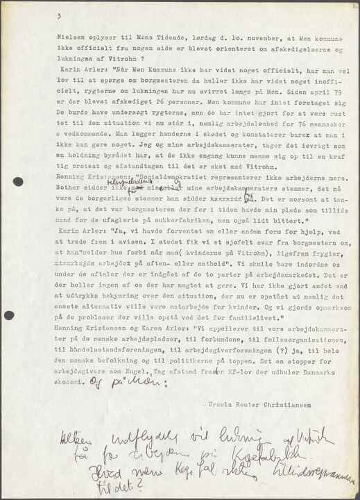 Karin Arler: ”Ja, vi havde forventet en eller anden form for hjælp, ved at træde frem i avisen. I stedet fik vi et sjofelt svar fra borgmesteren om, at han ”melder hus forbi når man (kvinderne på Vitrohm), ligefrem frygter, arbejde på aften- eller nathold”. Vi skulle bare indordne os under de aftaler der er indgået af de to parter på arbejdsmarkedet. Det er der heller ingen af os der har nægtet at gøre. Vi har ikke gjort andet end at udtrykke bekymring over den situation, der nu er opstået at nemlig det eneste alternativ ville være natarbejde for kvinder. Og vi gjorde opmærksom på de problemer der ville opst¨å ved det for familielivet.”