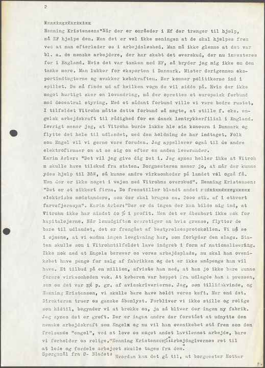 Henning Kristensen: ”Når der er områder i Ef der trænger til hjælp, må Ef hjælpe dem. Men det er vel ikke meningen at de skal hjælpes frem ved at man efterlader os i arbejdsløshed. Man må ikke glemme at det var bl.a. de mønske arbejdere, der har skabt det overskud, der nu investeres for i England. Hvis det var tanken med EF, så bryder jeg mig ikke om den tanke mere. Man lukker for eksporten i Danmark. Mister derigennem eksportindtægterne og svækker købekraften. Her kommer politikerne ind i spillet. De må finde ud af hvilken vogn de vil sidde på. Hvis der ikke meget hurtigt sker en lovændring, må der oprettes et europæisk forbund med decentral styring. Med et sådant forbund ville vi være bedre rustet. I tilfældet Vitrohm måtte dette forbund så nægte, at stille f.eks. engelsk arbejdskraft til rådighed for en dansk løntrykkerfilial i England. I øvrigt mener jeg, at Vitrohm burde lukke hele sin koncern i Danmark og flytte det hele til udlandet, med den holdning de har indtaget. Folk som Engel vil vi gerne være foruden. Jeg appellerer også til de andre elektrofirmaer om at se sig om efter en anden leverandør.