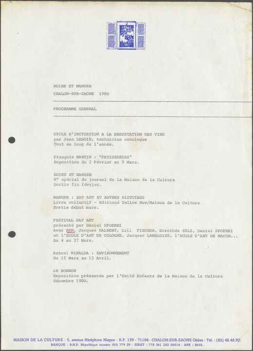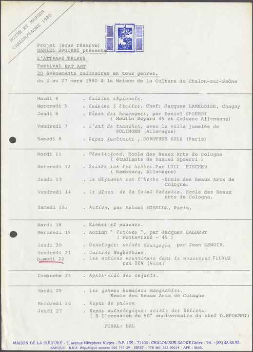 Daniel Spoerri asked me to organize on the 15th March 1980 at the Maison de la Culture de CHALON S/SAONE, an evening and show on food.