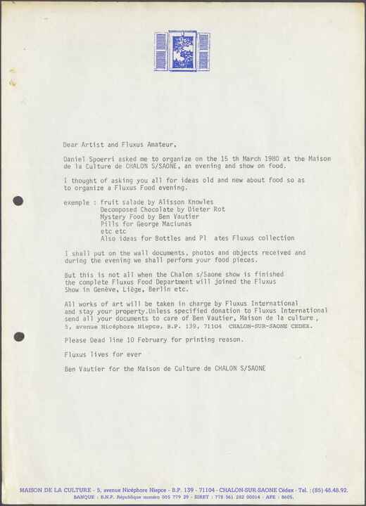All works of art will be taken in charge by Fluxus International and stay your property. Unless specified donation to Fluxus International send all your documents to care of Ben Vautier, Maison de la Culture, 5, avenue Nicéphore Niepce, B.P. 139, 71104 CHALON-SUR SAONE CEDEX.