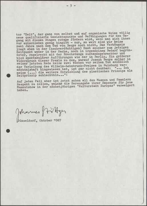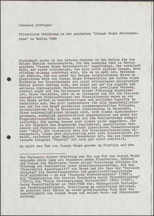Öffentliche Erklärung zu der geplanten "Joseph Beuys Retrospektive" in Berlin 1988