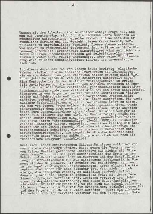 Zwei sich leicht aufdrängenden Mißverständnissen soll hiervon vorneherein vorgebeugt werden. Diese gegen die Vorgehensweise von Heiner Bastian gerichtete Initiative hat nichts mit "Diadochenkampf" zu tun. Sie gilt ausschließlich der Sorge um den Schutz und Erhalt eines hohen Kulturgutes und der Sensibilisierung der Öffentlichkeit für die spezifische Problematik im Umgang mit dem Beuys-Werk. Sie gründet auf sachlichen, wenn auch in der Regel verdrängten Gesichtspunkten, deren allgemeine Akzeptanz aber schon für bald absehbar ist. Wenn sich dennoch einige, die das genau wissen, so auffällig verdeckt halten, dann nur, weil sie längst in irgendeiner Weise mit jenem Berliner Großprojekt verfilzt sind. Zweitens vertrete ich nicht etwa die dogmatische Auffassung, man müsse Beuys-Installationen gleichsam für alle Ewigkeit da, wo sie sich nun einmal befinden, fixieren. Das wäre in der Tat ein zwanghaftes, rückwärtsgewandtes und dem Beuys'sehen Geist zuwiderlaufendes - kurz: ein unkünstlerisches Bild. Ich verweise vielmehr auf den wesentlichen Fak-