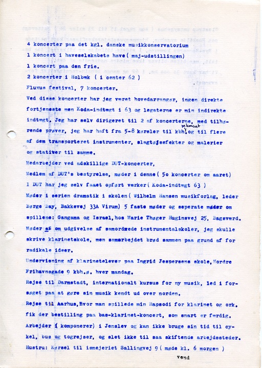 Ved disse koncerter har jeg været hovedarrangør, ingen direkte fortjeneste men Koda-indtægt i 63 og legaterne er min indirekte indtægt. Jeg har selv dirigeret til 2 af koncerterne, med tilhørende prøver, jeg har haft fra 5-8 kørsler til kbh [pr. koncert] og til flere af dem transporteret instrumenter, slagtøjsefekter og malerier og stativer til samme.