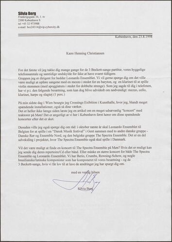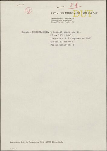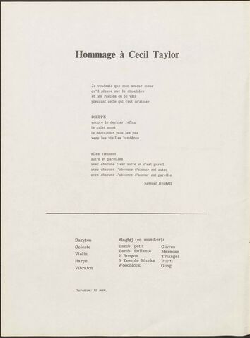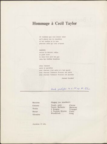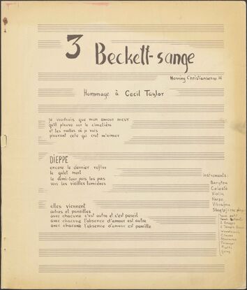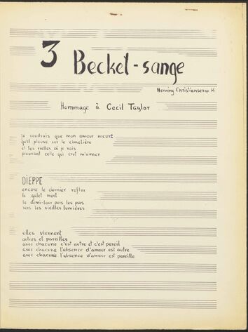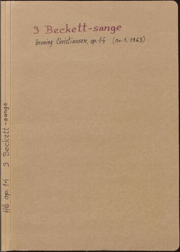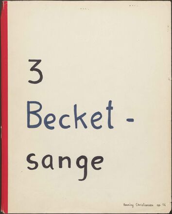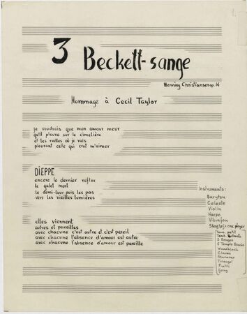 Back Henning Christiansen's archive Op. 14, 3 Beckett-sange Author/Key figure Henning Christiansen Facts PDF Document type Score Date 1963-01-30 Omtalte værker Op. 14, 3 Beckett-sange Original