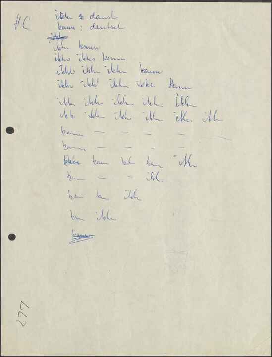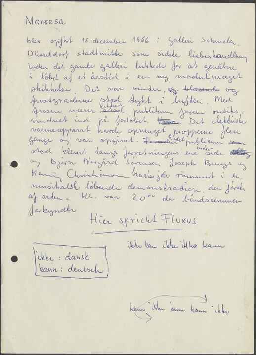 Blev opført 15. december 1966 i galleri Schmela, Düsseldorf stadtmitte som sidste liebeshandlung inden det gamle galleri lukkede for at genåbne i løbet af et årstid i en ny modulpræget skikkelse. Det var vinter, [og blæsende] og frostgraderne stod tykt i luften. Med frosne næser [stod] kikkede publikum foran butiksvinduet ind på forløbet. Det elektriske varmeapparat havde sprunget propperne flere gange og varopgivet. [Foruden] Andet publikum [som] stod klemt langs forretningens ene inderside [deltog] og Bjørn Nørgård S’ørensen Joseph Beuys og Hennign Christiansen bearbejder rummet i en musikalsk løbende denomstration, den første af arten. Kl. var 20.00 da båndstemmen forkyndte