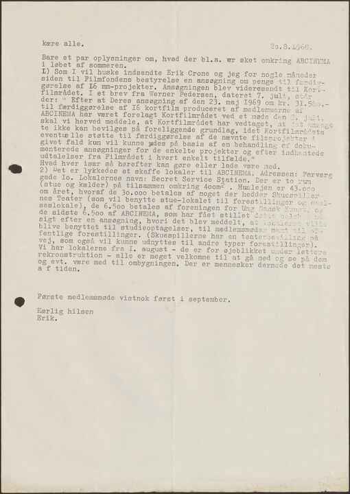 1) Som I vil huske indsendte Erik Crone og jeg for nogle måneder siden til Filmfondens bestyrelse en ansøgning om penge til færdiggørelse af 16 mm-projekter. Ansøgningen blev videresendt til Kortfilmrådet. I et brev fra Verner Pedersen, dateret 7. juli, står der: ”Efter at Deres ansøgning af den 23. maj 1969 om kr. 31.580,-- til færdiggøreIse af 16 kortfilm produceret af medlemmerne af ABCINEMA har været forelagt Kortfilmrådet ved et møde den 3. juli, skal vi hermed meddele, at Kortfilmrådet har vedtaget, at at det ansøgte ikke kan bevilges på foreliggende grundlag, idet Kortfilmrådets eventuelle støtte til færdiggørelse af de nævnte filmprojekter i givet fald kun vil kunne ydes på basis af en behandling af dokumenterede ansøgninger for de enkelte projekter og efter indhentede udtalelser fra Filmradet i hvert enkelt tilfælde,”