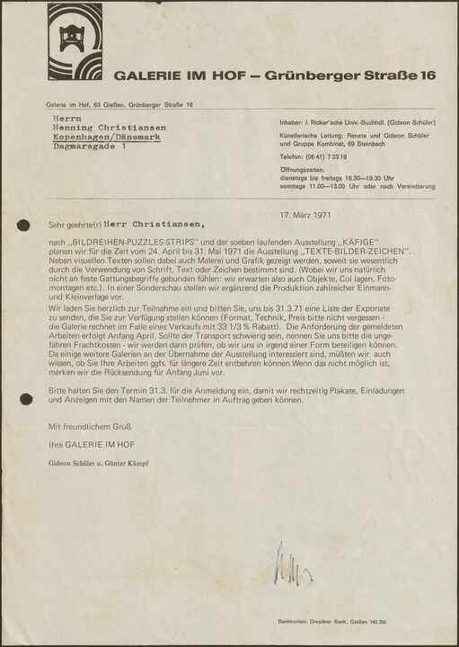 nach ”BILDREIHEN-PUZZLES-STRIPS” und der soeben laufenden Ausstellung “KÄFIGE” planen wir für die Zeit vom 24. April bis 31. Mai 1971 die Ausstellung “TEXTE-BILDER-ZEICHEN”. Neben visuellen Texten sollen dabei auch Malerei und Grafik gezeigt werden, soweit sie wesentlich durch die Verwendung von Schrift, Text oder Zeichen bestimmt sind. (Wobei wir uns natürlich nicht an feste Gattungsbegriffe gebunden fühlen: wir erwarten also auch Objekte, Collagen, Fotomontagen etc.). In einer Sonderschau stellen wir ergänzend die Produktion zahlreicher Einmannund Kleinverlage vor.