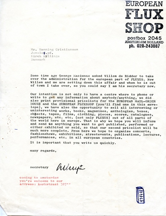 Our intention is not only to have a centre where to phone or write to get any information about anybody/anything, we did also print provisional pricelists for the EUROPEAN MAIL-ORDER HOUSE and the EUROPEAN FLUXSHOP (you'll find one in this envelope), we have also the opportunity to sell all interesting or uninteresting works, books, magazines, anthologies, boxes, objects, tapes, films, clothing, pieces, scores, catalogues, newspapers, etc. etc. (not only FLUXUS) out of all parts of the world here in europe. That is why we hope you will inform and send us anything you want to get published, performed or either exhibited or sold, so that our second pricelist will be much more complete. From here we hope to organize concerts, fashionshows, exhibitions, streetevents, publications, lectures, performances, etc. in all european countries.