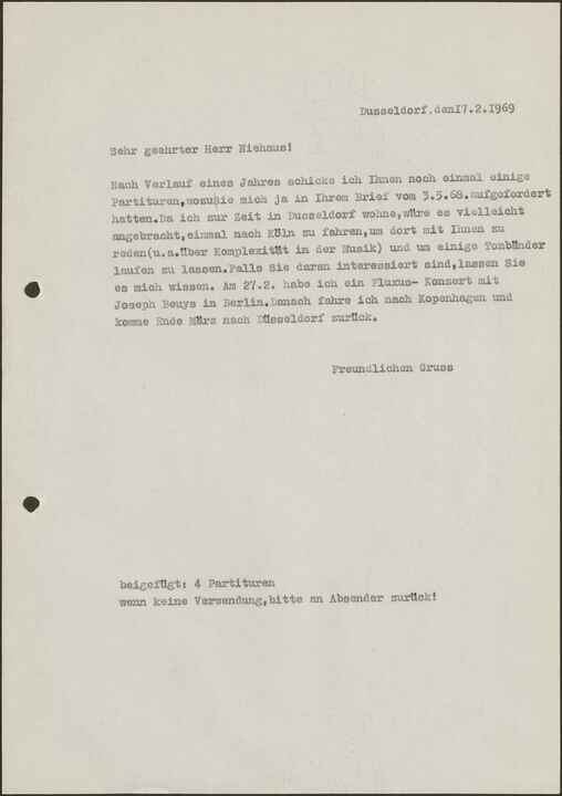 Nach Verlauf eines Jahres schicke ich Ihnen noch einmal einige Partituren, wozu Sie mich ja in Ihrem Brief vom 3.3.68 aufgefordert hatten. Da ich zur Zeit in Düsseldorf wohne, wäre es vielleicht angebracht,einmal nach Köln zu fahren, um dort mit Ihnen zu reden (u.a. über Komplexität in der Musik) und um einige Tonbänder laufen zu lassen. Falls Sie daran interessiert sind, lassen Sie es mich wissen. Am 27.2. habe ich ein Fluxus-Konzert mit Joseph Beuys in Berlin. Danach fahre ich nach Kopenhagen und komme Ende März nach Düsseldorf zurück.