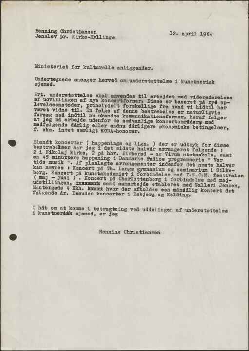 Evt. understøttelse skal anvendes til arbejdet med videreførelsen af udviklingen af nye koncertformer. Disse er baseret på nye oplevelesesmetoder, principelt forskellige fra hvad vi hidtil har været vidne til. En følge af denne bestræbelse er naturligvis forsøg med indtil nu ukendte kommunikationsformer, heraf følger at jeg må arbejde udenfor de sædvanlige koncertområderm med medfølgende dårlig eller endnu dårligere økonomiske betingelser, f. eks. intet særligt KODA-honorar.