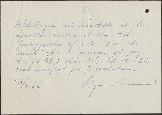 Afdelingen må henstille til at der afsættes ekstra ss. tid til færdiggørelse af uds. ”Vor tids musik” (der er placeret på prg. ti. 1/2 66) ma. 31/1 kl 18-22 med mulighed for fortsættelse.