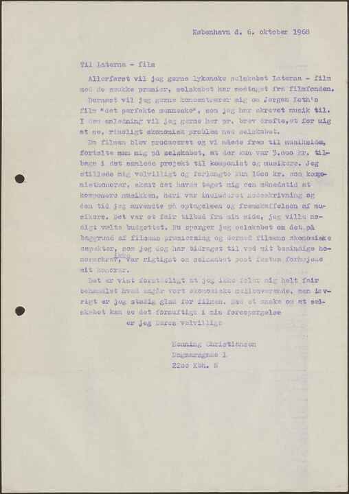 dernest vil jeg gerne koncentrere mig om Jørgen Leth’s film ”Det perfekte menneske”, som jeg har skrevet musik til. I den anlednign vil jeg gerne her pr. brev drøfte, et for mig at se, rimeligt økonomisk problem med selskabet.