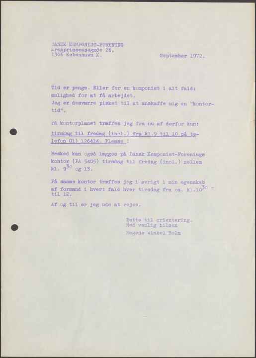 Besked kan også lægges på Dansk Komponist-Forenings kontor (PA 5405) tirsdag til fredag (incl.) mellem