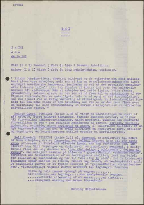 Artikel skrevet i anledning af udstillingen "IMI R Giese IMI r knoebel duesseldorf tyskland", organiseret af Ung Dansk Kunst, blev vist i De Studerendes Råds lokaler på Charlottenborg d. 18.-24. maj 1968.