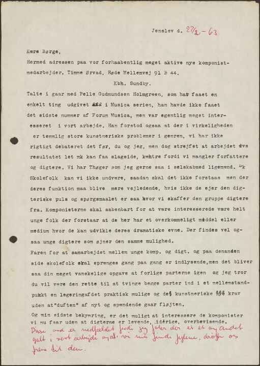 Talte i gaar med Pelle Gudmundsen Holmgreen, som hat faaet en enkelt ting udgivet i Musica serien, han havde ikke faaet det sidste nummer af Forum Musica, men var egentlig meget interesseret i vort arbejde. Han forstod ogsaa at der i virkeligheden er temmlig store kunstneriske problemer i genren, vi har ikke rigtigt debateret det før, du og jeg, men dog strejfet at arbejdet dvs resultatet let mk kan faa slagside, kæhtre fordi vi mangler forfattere og digtere. Vi har Thøger som jeg gerne saa i selskab med ligemænd. Skolefolk kan vi ikke undvære, saadan skal det ikke forstaas men der deres funktion maa blive mere vejledende, hvis ikke de ejer den digteriske puls og spørgsmaalet er saa hvor vi skaffer den gruppe digtere fra. Komponisterne skal aabenbart for at være interesserede være helt unge folk der forstaar at de her har et overkommeligt middel eller medium hvor de kan udvikle deres dramatiske evne. Der findes vel ogsaa unge digtere som øjner den samme mulighed.
