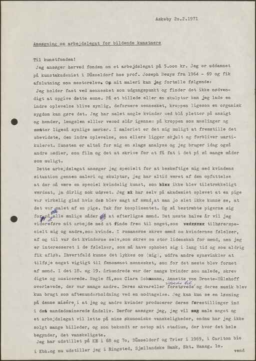 Dette arbejdslegat ansøger jeg specielt for at beskæftige mig med kvindens situation gennem maleri og skulptur, jeg har altid været af den opfattelse at der må være en speciel kvindelig kunst, som ikke blev tilstrækkeligt værdsat, ja dårlig nok udøvet. Jeg har selv på akademiet oplevet at en pige var virkelig glad hvis det blev sagt af mænd, at man jo slet ikke kunne se, at det var malet af en pige. Tak for komplimentet. Og så bestræbte pigerne sig for, på alle mulige måder at efterligne mænd. Det næste halve år vil jeg videreføre mit arbejde med at finde frem til noget, som tilhører specielt mig og andre, som kvinde. I romanerne skrev mænd om kvindernes følelser, af og til var det kvinderne selv, som skrev om stor lidenskab for mænd, men jeg er interesseret i de følelser, som må have ophobet sig i lang tid og som aldrig fik afløb. I hvert fald kunne det lykkes os (mig), ud fra andre synsvinkler at tilføje noget vigtigt til fænomenet mennesket, som for det meste blev formet af mænd. I det 18. og 19. århundrede var der mange kvinder som malede, skrev digte og musicerede. Nogle få, som Clara Schumann, Annette von Droste-Hülshoff overlevede, der var mange andre. Deres akvareller forstøvede [støvede til] og deres musik blev kun brugt som aftenunderholdning ved en modtagelse. Jeg kan kun se en løsning på denne misere, i at jeg og andre kvinder producerer deres forestillinger ind i det mandsdominerede åndsliv. Derfor ansøger jeg, jeg vil male meget og et arbejdslegat vil lette på mine økonomiske vanskeligheder, endnu har jeg ikke solgt mange billeder, og som bekendt er netop mit stadium, der hvor det hele begynder, det vanskeligste.