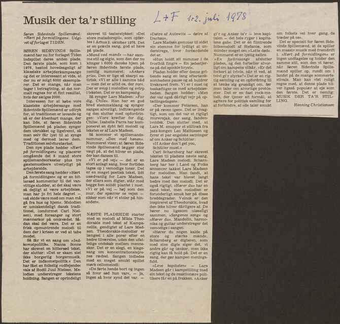 SØREN SIDEVINDS Spillemænd har nu for forlaget Tiden indspillet deres anden plade. Den første plade, som kom i 1976, bestod hovedsageligt af klassiske arbejderkampsange og det er interessant at vide, at der nu er solgt 6000 eksemplarer. Det er mange, når man tager i betragtning, at det normalt regnes for et fint resultat, hvis der sælges 2000. Interessen for at købe vore klassiske arbejdersange med Sidevinds Spillemænd er udtryk for, at traditionen er levende og så er der åbenbart mange, der kan lide, at Søren Sidevinds Spillemænd på pladen synger dem ukrukket og ligefremt, så man selv får lyst til at synge med og dermed lærer dem. Traditionen selvforstærket.