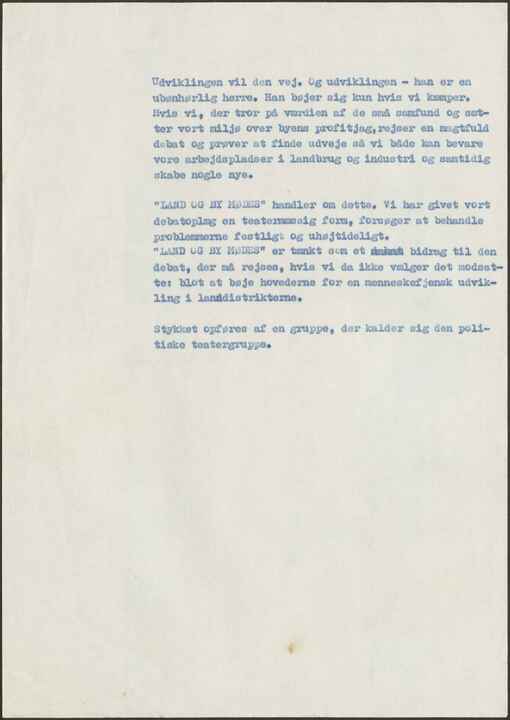 ”LAND OG BY MØDES” handler om dette. Vi har givet vort debatoplæg en teatermæssig form, forsøger at behandle problemerne festligt og uhøjtideligt.