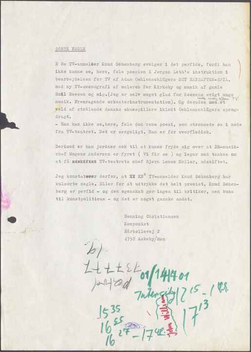 E Bs TV-anmelder Knud Schønberg svælger i det perfide, fordi han ikke kunne se, høre, føle poesien i Jørgen Leth’s instruktion i bearbejdelsen for TV af Adam Oehlenschlägers SCT HANSAFTEN-SPIL, med ny TV-scenografi af maleren Per Kirkeby og musik af gamle Emil Reesen og mig. (Jeg er selv meget glad for Reesens evigt unge musik. Fremragende orkesterinstrumentation). Og desuden med havde søndag aftens TV et væld af strålende danske skuespillere iklædt Oehlenschlägers sprogdragt.