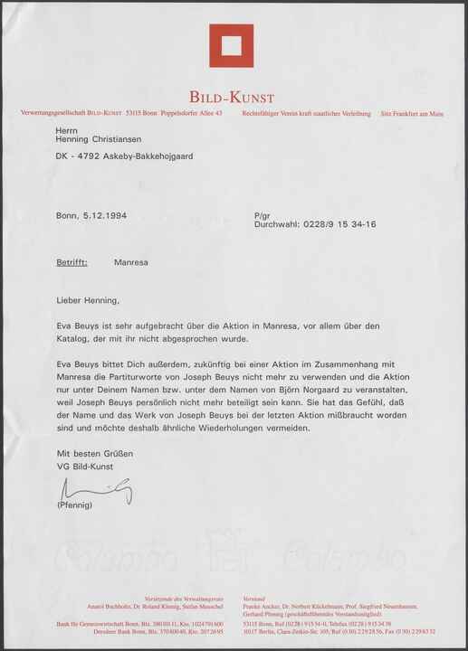 Eva Beuys bittet Dich außerdem, zukünftig bei einer Aktion im Zusammenhang mit Manresa die Partiturworte von Joseph Beuys nicht mehr zu verwenden und die Aktion nur unter Deinem Namen bzw. unter dem Namen von Björn Norgaard zu veranstalten, weil Joseph Beuys persönlich nicht mehr beteiligt sein kann. Sie hat das Gefühl, daß der Name und das Werk von Joseph Beuys bei der letzten Aktion mißbraucht worden sind und möchte deshalb ähnliche Wiederholungen vermeiden.