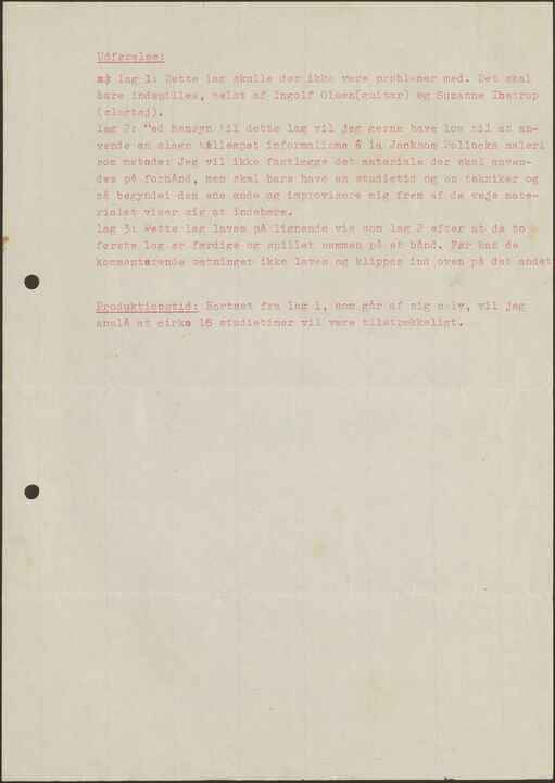 2. Et lag med alle slags lyde: Konkrete lyde, citater fra samtaler og radioudsendelser, grammofonplader osv. Disse lyde skal udgøre et forholdsvis tilfældigt sammenbrgat stof. Bliver det for "tilrettelagt” kommer i det modstrid med projektets grundintentionen.
