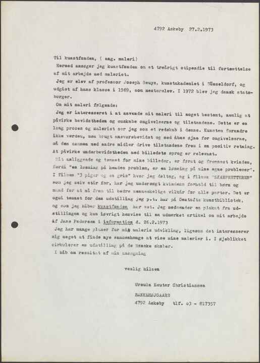 Mit anliggende og temaet for mine billeder, er først og fremmest kvinden, fordi ”en løsning på hendes problem, er en løsning på mine egne problemer”. I filmen ”3 piger og en gris” hvor jeg deltog, og i filmen ”SKARPRETTEREN” som jeg selv står for, har jeg undersøgt kvindens forhold til børn og mand for at nå frem til bedre menneskelige vilkår for alle parter. Det er også temaet ior den udstilling jeg p.t. har på Gentofte kunstbibliotek, og som jeg håber kunstfonden har set. Jeg medsender en plakat fra udstillingen og kan iøvrigt henvise til en udmærket artikel om mit arbejde af Jane Pedersen i information d. 26 .2.1973