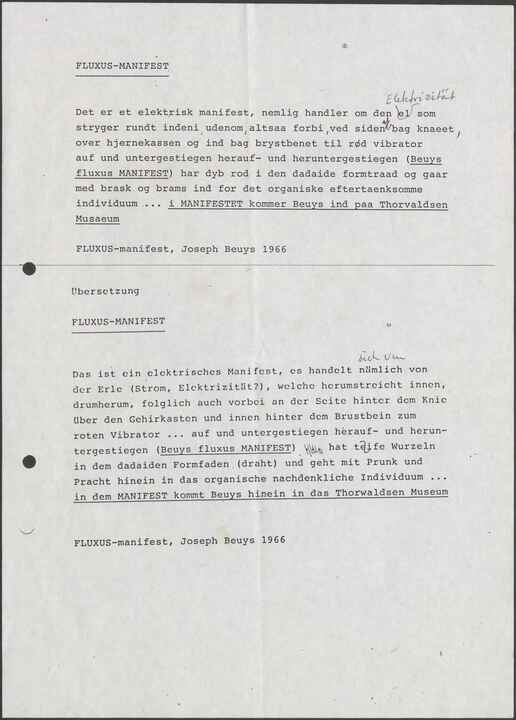 Det er et elektrisk manifest, nemlig handler om den [el] [Elektrizität] som stryger rundt indeni udenom, altsaa forbi, ved siden af, bag knaeet over hjernekassen og ind bag brystbenet til rød vibrator auf und untergestiegen herauf- und heruntergestiegen (Beuys fluxus MANIFEST) har dyb rod i den dadaide formtraad og gaar med brask og brams ind for det organiske eftertaenksomme individuum.... i MANIFESTET kommer Beuys ind paa ThorvaldsenMusaeum