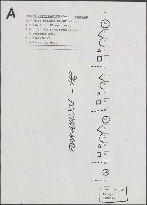 Indhold af Joseph Beuys' Manresa-bånd/fortegnelse over Bjørn Nørgaards og HCs bidrag til lydbilledet i Manresa