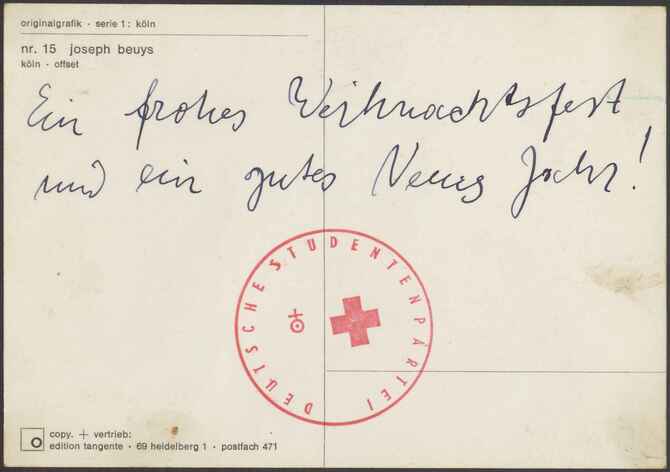 Postkortet (Edition tangente serie 1, nr. 15) blev udgivet i 1968 og stemplet af Deutsche Studentenpartei blev mest benyttet i 1967-68.