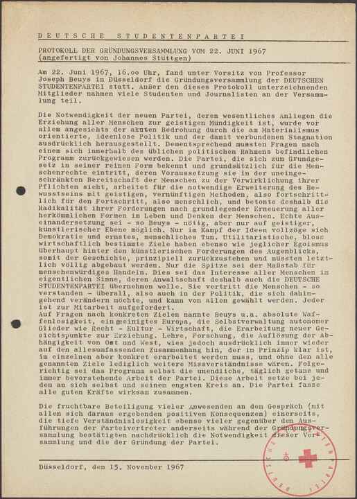 Am 22. Juni 1967, 16.00 Uhr, fand unter Vorsitz von Professor Joseph Beuys in Düsseldorf die Gründungsversammlung der DEUTSCHEN STUDENTENPARTEI statt. Außer den dieses Protokoll unterzeichnenden Mitglieder nahmen viele Studenten und Journalisten an der Versammlung teil.