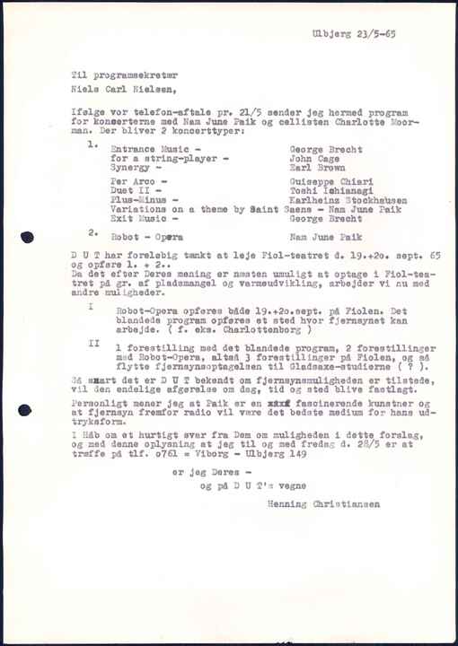 Ifølge vor telefon-aftale pr. 21/5 sender jeg hermed program for koncerterne med Nam June Paik og cellisten Charlotte Moorman. Der bliver 2 koncerttyper: