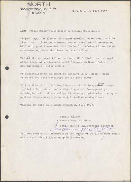 Vi planlægger et nummer af NORTH-Information om Daner Galleriet. Det vil blive udformet som en antologi af tekster og billeder, og vi henvender os i denne forbindelse til en række mennesker og beder dem lave en tekst til os.