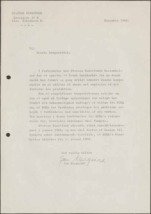 I forbindelse med Statens Kunstfonds bestræbelser for at oprette et Dansk Musikarkiv for ny dansk musik har fondet en gang årligt anmodet danske komponister om at udfylde et skema med angivelse af det forløbne års produktion.