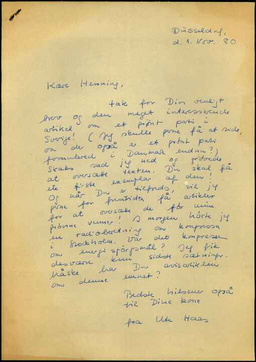 Tak for Din venligt brev og den meget interesserende artikel om et grønt parti i Sverige! (Jeg skulle gerne få at vide, om der også er et sådant parti formulered i Danmark endnu?) Straks sad jeg ned og prøvede at oversæte texten Du skal få et firste exemplar af den!