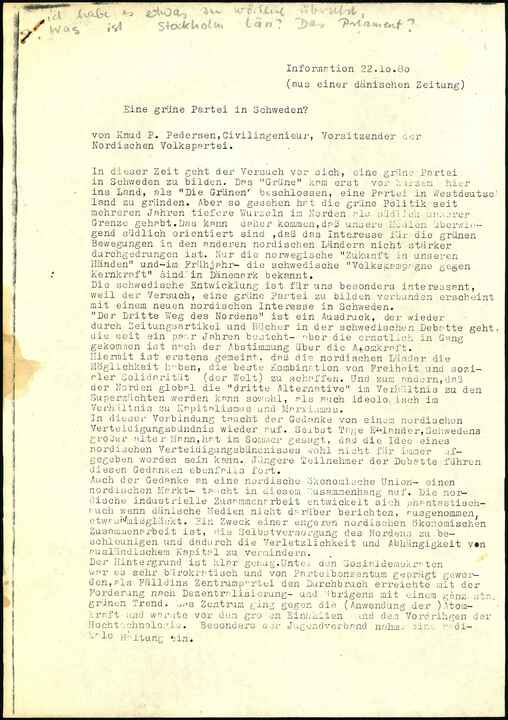 In dieser Zeit geht der Versuch vor sich, eine grüne Partei in Schweden zu bilden. Das "Grüne" kam erst vor kurzem hier ins Land, als "Die Grünen” beschlossen, eine Partei in Westdeutschland zu gründen. Aber so gesehen hat die grüne Politik seit mehreren Jahren tiefere Wurzeln im Norden als südlich unserer Grenze gehabt. Das kann daher kommen, daß unsere Medien überwiegend südlich orientiert sind , daß das Interesse für die grünen Bewegungen in den anderen nordischen Ländern nicht stärker durchgedrungen ist. Nur die norwegische "Zukunft in unseren Händen" und -im Frühjahr- die schwedische "VolksKampagne geyen Kernkraft" sind in Dänemark bekannt.